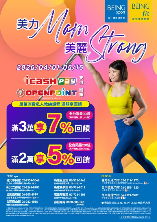 (已結束)🎉 BEING fit 22週年感謝祭開跑! 🎉 💪 私人教練課程🏷 單筆消費滿2萬元,贈8%OPENPOINT點數💳 用uniopen 聯名卡,最高再送6000元私人教練課程抵用券|教練課優惠|